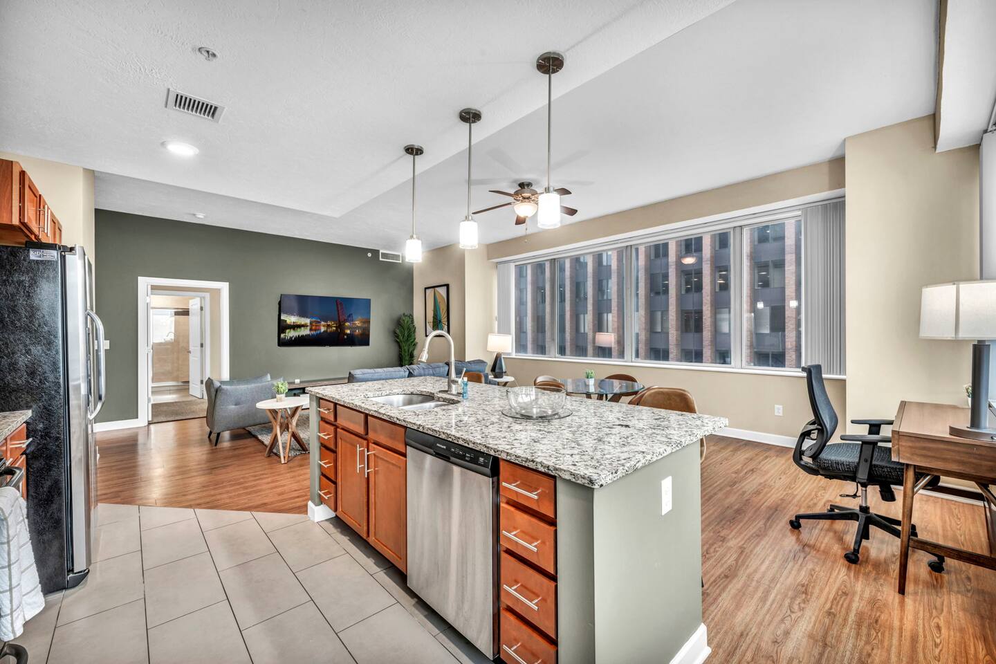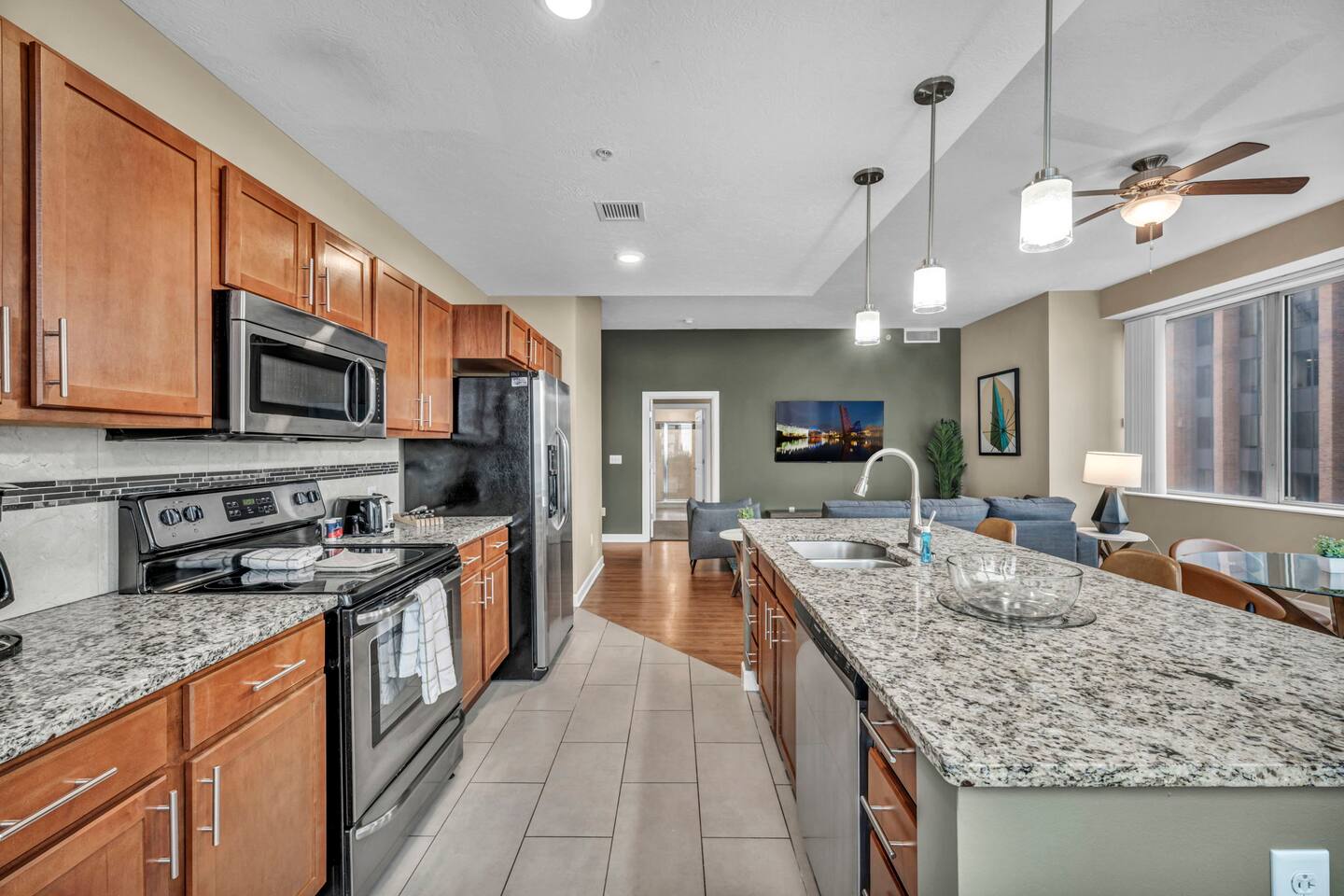 The luxurious condo is built to provide a premium getaway for visitors seeking the perfect stay. Its blend of modern elegance and upscale comfort in one of downtown Cleveland’s most desirable neighborhoods offers both relaxation and sophistication. Each room features high ceilings, stylish finishes, and carefully chosen décor that elevate the space with a contemporary yet timeless feel. Every detail is designed for comfort, from a fully equipped kitchen with modern appliances to cozy bedrooms with plush memory foam mattresses. Two highly comfortable bedrooms plus a sofa bed provide plenty of space for rest and relaxation after an exciting day exploring Cleveland. Finally, you’ll enjoy access to top-tier building amenities including a fitness center, fast elevators, 24/7 security, and nearby parking, all while being steps from restaurants, theaters, and sporting events. ★ LIVING ROOM ★ The living room is perfect for unwinding after a day in the city. Lounge on the sofa, stream your favorite shows, or enjoy the stylish setting. ✔ Queen-Size Sofa Bed ✔ Elegant Décor & Finishes ✔ 55" Smart TV with Streaming Apps ✔ Stylish Coffee Table ✔ Comfortable Seating ★ KITCHEN & DINING ★ Cook and dine in style with a chef-inspired kitchen, or take advantage of the incredible dining options just steps away. ✔ Stove & Oven ✔ Microwave ✔ Coffee Maker ✔ Toaster ✔ Blender ✔ Refrigerator/Freezer ✔ Dishwasher ✔ Sink – Hot & Cold Water ✔ Glassware, Silverware, Pots & Pans ✔ Washer/Dryer ✔ Dining Table with Seating for 4 ✔ Kitchen Island with Seating for 3 ★ SLEEPING ARRANGEMENTS – 2 BEDROOMS ★ Each bedroom is designed for comfort, relaxation, and restful sleep. ♛ Master Bedroom: King-Size Memory Foam Bed ♛ Bedroom 2: Queen-Size Memory Foam Bed ♛ Living Room: Queen-Size Sofa Bed ✔ Premium Pillows, Linens, and Sheets ✔ Spacious Closets with Hangers and Shelves ✔ Night Stands with Reading Lamps ✔ Smart TVs ★ BATHROOMS ★ Enjoy spa-like bathrooms stocked with essentials for your convenience. ✔ Walk-In Shower ✔ Modern Vanity with Mirror ✔ Toilet ✔ Towels ✔ Hair Dryer ✔ Essential Toiletries ★ BUILDING AMENITIES ★ ✔ Parking Available ($20/day charged after booking is approved if requested, unlimited in/out access. Most parking garages in downtown charge $10-20 per 1 entry/day) ✔ 24/7 Security ✔ Fast Elevators ✔ Fully Equipped Gym ✔ On-Site Dining: Al’s Deli (Mon–Fri, coffee, breakfast & lunch) ★ PRIME DOWNTOWN LOCATION ★ You’re within easy walking distance of Cleveland’s top attractions: ✔ Rocket Mortgage FieldHouse – 8 min walk ✔ Progressive Field – 10 min walk ✔ FirstEnergy Stadium – 12 min walk ✔ Huntington Convention Center – 10 min walk ✔ East 4th Street Dining – 6 min walk ✔ Rock & Roll Hall of Fame – 15 min walk ✔ Public Square Park – 8 min walk ✔ Lake Erie Waterfront & Pier – 15 min walk Nearby Dining: Marble Room (2 min walk), Butcher and the Brewer (6 min walk), Mabel’s BBQ (6 min walk), TownHall (7 min drive). Nearby Parks: Perk Park (3 min walk), Mall B (8 min walk), Edgewater Park & Beach (10 min drive). Medical Facilities: Cleveland Clinic (15 min drive), University Hospitals (15 min drive), MetroHealth (10 min drive). Universities: Cleveland State University (10 min walk), Case Western Reserve (15 min drive). This property combines downtown luxury with modern comfort, making it the perfect base for business, leisure, or convention travel. Whether you’re here for dining, theater, sports, or the lakefront, you’ll be right in the heart of it all.