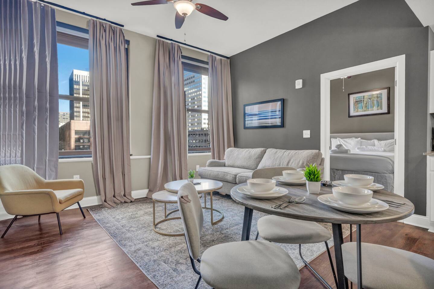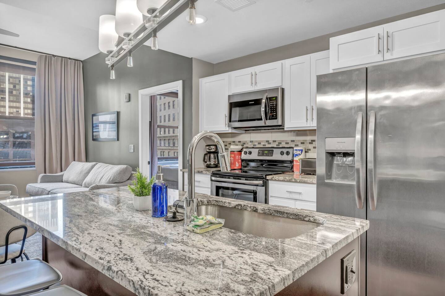 ★ ADDITIONAL ACCOMMODATION ★ Traveling in a larger group, or your preferred dates are already taken? You'll be happy to know that we offer additional units in the building with an option of renting multiple together. Please browse our host profile for the complete list of gorgeous listings. ★ CLEANING & SANITIZATION ★ Health, safety, and well-being of our guests are of utmost importance. For this reason, we use a thorough cleaning process after each check-out. ★ GUEST SCREENING & DAMAGE PROTECTION ★ The Primary Reservation holder must provide a valid Government-issued ID prior to check-in. ★ BUILDING & CONDO SECURITY MEASURES ★ • Minut noise detectors are located in the apartment and monitor noise levels. • Surveillance cameras monitor building common areas (never inside the unit). • 24/7 building security. ★ PETS ALLOWED ★ We love those little (and not so little) furry bundles of joy. We charge a $25 per night, $100 per week, or $300 per month pet cleaning fee (per pet). This fee will be charged via Airbnb Resolution Center if not collected at booking. ✔ Maximum of 2 pets, must be well trained. ✔ No aggressive breeds or pit bulls permitted. ★ NO SMOKING INSIDE ★ Please refrain from smoking inside the home. 🚭 Any evidence of smoking will result in fees for odor removal and furniture cleaning and immediate eviction without refund. ★ NO PARTIES/EVENTS ★ We kindly ask you to treat our home as your own to preserve its pristine condition for future guests and your return visits. Any unauthorized parties or events will result in immediate eviction without refund. ★ ADDITIONAL FEES ★ • Early Check-In: $25 (2 PM) or $50 (12 PM), subject to host approval and cleaner availability. • Late Check-Out: $25 (12 PM), subject to host approval and cleaner availability. • Lost Fob/Card: $150 replacement fee. Fobs/cards must be returned to the lockbox upon checkout. ★ AMENITY DISCLAIMER ★ • Amenities outside of the apartment (gym, garage, etc.) are managed by the building and subject to maintenance outside of our control. • Temporary amenity closures do not warrant a refund. Please inquire about amenity status before booking. ★ PARKING INFORMATION ★ • $20/day for unlimited in/out access for 1 car. Please message us to request a parking pass and we will send a payment request. • Parking garage is managed by an independent company across the building. • Garage clearance: 6'-3". ★ FIREPLACE NOTICE ★ The fireplace is for display only and is not functional