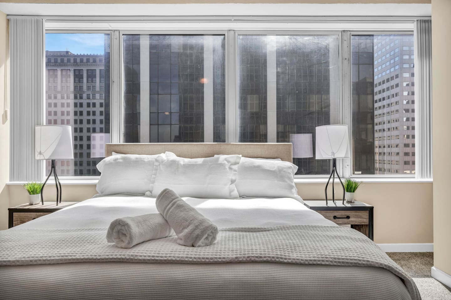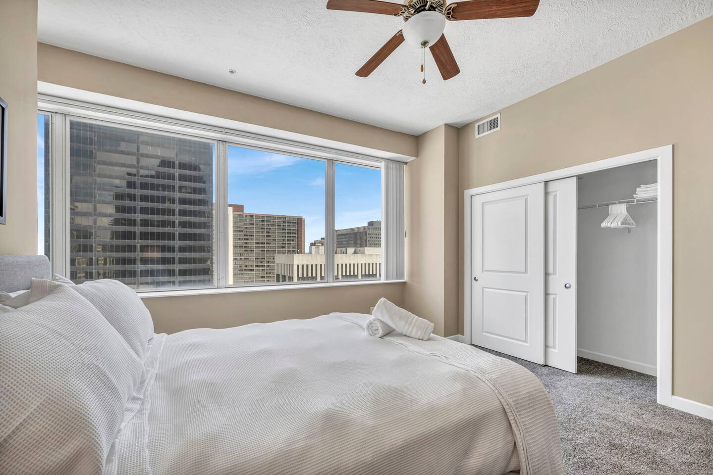 The luxurious condo is built to provide a premium getaway for visitors seeking the perfect stay. Its blend of modern elegance and upscale comfort in one of downtown Cleveland’s most desirable neighborhoods offers both relaxation and sophistication. Each room features high ceilings, stylish finishes, and carefully chosen décor that elevate the space with a contemporary yet timeless feel. Every detail is designed for comfort, from a fully equipped kitchen with modern appliances to cozy bedrooms with plush memory foam mattresses. Two highly comfortable bedrooms plus a sofa bed provide plenty of space for rest and relaxation after an exciting day exploring Cleveland. Finally, you’ll enjoy access to top-tier building amenities including a fitness center, fast elevators, 24/7 security, and nearby parking, all while being steps from restaurants, theaters, and sporting events. ★ LIVING ROOM ★ The living room is perfect for unwinding after a day in the city. Lounge on the sofa, stream your favorite shows, or enjoy the stylish setting. ✔ Queen-Size Sofa Bed ✔ Elegant Décor & Finishes ✔ 55" Smart TV with Streaming Apps ✔ Stylish Coffee Table ✔ Comfortable Seating ★ KITCHEN & DINING ★ Cook and dine in style with a chef-inspired kitchen, or take advantage of the incredible dining options just steps away. ✔ Stove & Oven ✔ Microwave ✔ Coffee Maker ✔ Toaster ✔ Blender ✔ Refrigerator/Freezer ✔ Dishwasher ✔ Sink – Hot & Cold Water ✔ Glassware, Silverware, Pots & Pans ✔ Washer/Dryer ✔ Dining Table with Seating for 4 ✔ Kitchen Island with Seating for 3 ★ SLEEPING ARRANGEMENTS – 2 BEDROOMS ★ Each bedroom is designed for comfort, relaxation, and restful sleep. ♛ Master Bedroom: King-Size Memory Foam Bed ♛ Bedroom 2: Queen-Size Memory Foam Bed ♛ Living Room: Queen-Size Sofa Bed ✔ Premium Pillows, Linens, and Sheets ✔ Spacious Closets with Hangers and Shelves ✔ Night Stands with Reading Lamps ✔ Smart TVs ★ BATHROOMS ★ Enjoy spa-like bathrooms stocked with essentials for your convenience. ✔ Walk-In Shower ✔ Modern Vanity with Mirror ✔ Toilet ✔ Towels ✔ Hair Dryer ✔ Essential Toiletries ★ BUILDING AMENITIES ★ ✔ Parking Available ($20/day charged after booking is approved if requested, unlimited in/out access. Most parking garages in downtown charge $10-20 per 1 entry/day) ✔ 24/7 Security ✔ Fast Elevators ✔ Fully Equipped Gym ✔ On-Site Dining: Al’s Deli (Mon–Fri, coffee, breakfast & lunch) ★ PRIME DOWNTOWN LOCATION ★ You’re within easy walking distance of Cleveland’s top attractions: ✔ Rocket Mortgage FieldHouse – 8 min walk ✔ Progressive Field – 10 min walk ✔ FirstEnergy Stadium – 12 min walk ✔ Huntington Convention Center – 10 min walk ✔ East 4th Street Dining – 6 min walk ✔ Rock & Roll Hall of Fame – 15 min walk ✔ Public Square Park – 8 min walk ✔ Lake Erie Waterfront & Pier – 15 min walk Nearby Dining: Marble Room (2 min walk), Butcher and the Brewer (6 min walk), Mabel’s BBQ (6 min walk), TownHall (7 min drive). Nearby Parks: Perk Park (3 min walk), Mall B (8 min walk), Edgewater Park & Beach (10 min drive). Medical Facilities: Cleveland Clinic (15 min drive), University Hospitals (15 min drive), MetroHealth (10 min drive). Universities: Cleveland State University (10 min walk), Case Western Reserve (15 min drive). This property combines downtown luxury with modern comfort, making it the perfect base for business, leisure, or convention travel. Whether you’re here for dining, theater, sports, or the lakefront, you’ll be right in the heart of it all.