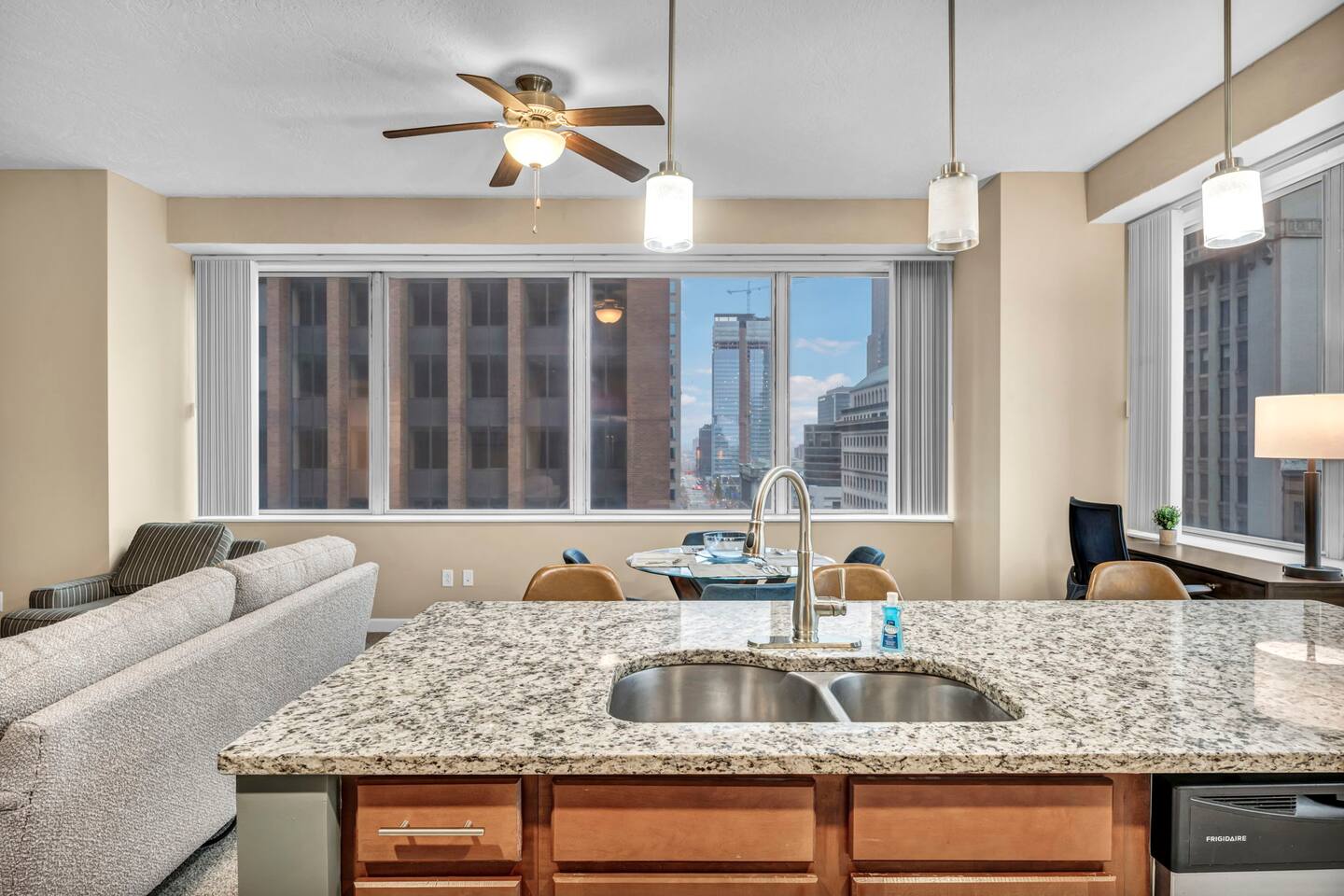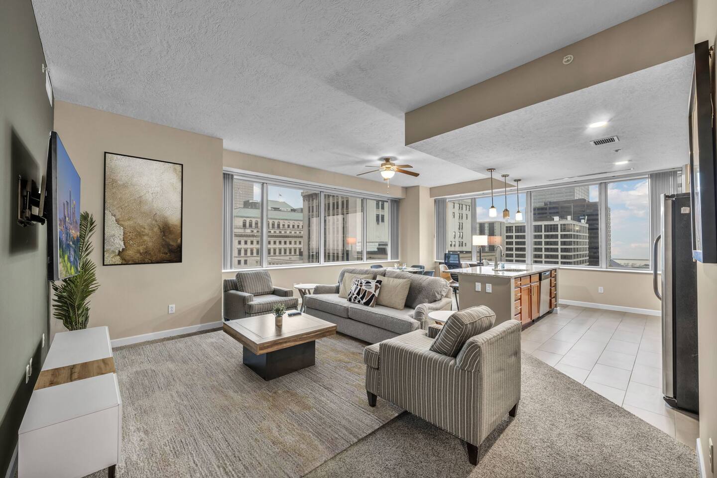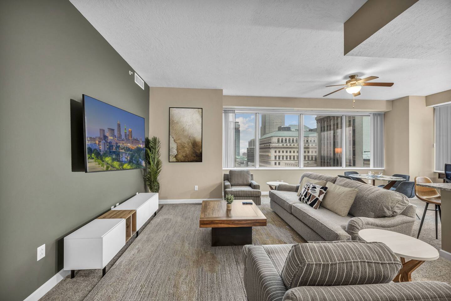 The luxurious condo is built to provide a premium getaway for visitors seeking the perfect stay. Its blend of modern elegance and upscale comfort in one of downtown Cleveland’s most desirable neighborhoods offers both relaxation and sophistication. Each room features high ceilings, stylish finishes, and carefully chosen décor that elevate the space with a contemporary yet timeless feel. Every detail is designed for comfort, from a fully equipped kitchen with modern appliances to cozy bedrooms with plush memory foam mattresses. Two highly comfortable bedrooms plus a sofa bed provide plenty of space for rest and relaxation after an exciting day exploring Cleveland. Finally, you’ll enjoy access to top-tier building amenities including a fitness center, fast elevators, 24/7 security, and nearby parking, all while being steps from restaurants, theaters, and sporting events. ★ LIVING ROOM ★ The living room is perfect for unwinding after a day in the city. Lounge on the sofa, stream your favorite shows, or enjoy the stylish setting. ✔ Queen-Size Sofa Bed ✔ Elegant Décor & Finishes ✔ 55" Smart TV with Streaming Apps ✔ Stylish Coffee Table ✔ Comfortable Seating ★ KITCHEN & DINING ★ Cook and dine in style with a chef-inspired kitchen, or take advantage of the incredible dining options just steps away. ✔ Stove & Oven ✔ Microwave ✔ Coffee Maker ✔ Toaster ✔ Blender ✔ Refrigerator/Freezer ✔ Dishwasher ✔ Sink – Hot & Cold Water ✔ Glassware, Silverware, Pots & Pans ✔ Washer/Dryer ✔ Dining Table with Seating for 4 ✔ Kitchen Island with Seating for 3 ★ SLEEPING ARRANGEMENTS – 2 BEDROOMS ★ Each bedroom is designed for comfort, relaxation, and restful sleep. ♛ Master Bedroom: King-Size Memory Foam Bed ♛ Bedroom 2: Queen-Size Memory Foam Bed ♛ Living Room: Queen-Size Sofa Bed ✔ Premium Pillows, Linens, and Sheets ✔ Spacious Closets with Hangers and Shelves ✔ Night Stands with Reading Lamps ✔ Smart TVs ★ BATHROOMS ★ Enjoy spa-like bathrooms stocked with essentials for your convenience. ✔ Walk-In Shower ✔ Modern Vanity with Mirror ✔ Toilet ✔ Towels ✔ Hair Dryer ✔ Essential Toiletries ★ BUILDING AMENITIES ★ ✔ Parking Available ($20/day charged after booking is approved if requested, unlimited in/out access. Most parking garages in downtown charge $10-20 per 1 entry/day) ✔ 24/7 Security ✔ Fast Elevators ✔ Fully Equipped Gym ✔ On-Site Dining: Al’s Deli (Mon–Fri, coffee, breakfast & lunch) ★ PRIME DOWNTOWN LOCATION ★ You’re within easy walking distance of Cleveland’s top attractions: ✔ Rocket Mortgage FieldHouse – 8 min walk ✔ Progressive Field – 10 min walk ✔ FirstEnergy Stadium – 12 min walk ✔ Huntington Convention Center – 10 min walk ✔ East 4th Street Dining – 6 min walk ✔ Rock & Roll Hall of Fame – 15 min walk ✔ Public Square Park – 8 min walk ✔ Lake Erie Waterfront & Pier – 15 min walk Nearby Dining: Marble Room (2 min walk), Butcher and the Brewer (6 min walk), Mabel’s BBQ (6 min walk), TownHall (7 min drive). Nearby Parks: Perk Park (3 min walk), Mall B (8 min walk), Edgewater Park & Beach (10 min drive). Medical Facilities: Cleveland Clinic (15 min drive), University Hospitals (15 min drive), MetroHealth (10 min drive). Universities: Cleveland State University (10 min walk), Case Western Reserve (15 min drive). This property combines downtown luxury with modern comfort, making it the perfect base for business, leisure, or convention travel. Whether you’re here for dining, theater, sports, or the lakefront, you’ll be right in the heart of it all.