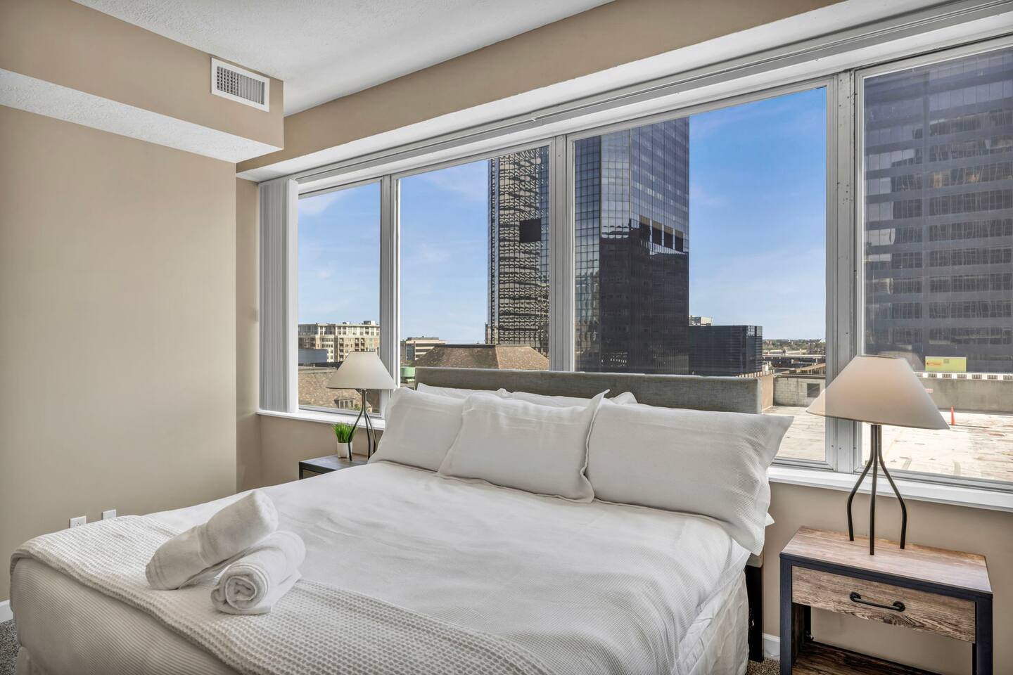 The luxurious condo is built to provide a premium getaway for visitors seeking the perfect stay. Its blend of modern elegance and upscale comfort in one of downtown Cleveland’s most desirable neighborhoods offers both relaxation and sophistication. Each room features high ceilings, stylish finishes, and carefully chosen décor that elevate the space with a contemporary yet timeless feel. Every detail is designed for comfort, from a fully equipped kitchen with modern appliances to cozy bedrooms with plush memory foam mattresses. Two highly comfortable bedrooms plus a sofa bed provide plenty of space for rest and relaxation after an exciting day exploring Cleveland. Finally, you’ll enjoy access to top-tier building amenities including a fitness center, fast elevators, 24/7 security, and nearby parking, all while being steps from restaurants, theaters, and sporting events. ★ LIVING ROOM ★ The living room is perfect for unwinding after a day in the city. Lounge on the sofa, stream your favorite shows, or enjoy the stylish setting. ✔ Queen-Size Sofa Bed ✔ Elegant Décor & Finishes ✔ 55" Smart TV with Streaming Apps ✔ Stylish Coffee Table ✔ Comfortable Seating ★ KITCHEN & DINING ★ Cook and dine in style with a chef-inspired kitchen, or take advantage of the incredible dining options just steps away. ✔ Stove & Oven ✔ Microwave ✔ Coffee Maker ✔ Toaster ✔ Blender ✔ Refrigerator/Freezer ✔ Dishwasher ✔ Sink – Hot & Cold Water ✔ Glassware, Silverware, Pots & Pans ✔ Washer/Dryer ✔ Dining Table with Seating for 4 ✔ Kitchen Island with Seating for 3 ★ SLEEPING ARRANGEMENTS – 1 BEDROOM ★ The bedroom is designed for comfort, relaxation, and restful sleep, with thoughtful touches to ensure you wake up refreshed. ♛ Master Bedroom: King-Size Memory Foam Bed ♛ Living Room: Queen-Size Sofa Bed ✔ Premium Pillows, Linens, and Sheets ✔ Spacious Closets with Hangers and Shelves ✔ Night Stands with Reading Lamps ✔ Smart TVs ★ BATHROOM ★ Enjoy a spa-like bathroom stocked with essentials for your convenience. ✔ Bathtub ✔ Modern Vanity with Mirror ✔ Toilet ✔ Towels ✔ Hair Dryer ✔ Essential Toiletries ★ BUILDING AMENITIES ★ ✔ Parking Available ($20/day charged after booking is approved if requested, unlimited in/out access. Most parking garages in downtown charge $10-20 per 1 entry/day) ✔ 24/7 Security ✔ Fast Elevators ✔ Fully Equipped Gym ✔ On-Site Dining: Al’s Deli (Mon–Fri, coffee, breakfast & lunch) ★ PRIME DOWNTOWN LOCATION ★ You’re within easy walking distance of Cleveland’s top attractions: ✔ Rocket Mortgage FieldHouse – 8 min walk ✔ Progressive Field – 10 min walk ✔ FirstEnergy Stadium – 12 min walk ✔ Huntington Convention Center – 10 min walk ✔ East 4th Street Dining – 6 min walk ✔ Rock & Roll Hall of Fame – 15 min walk ✔ Public Square Park – 8 min walk ✔ Lake Erie Waterfront & Pier – 15 min walk Nearby Dining: Marble Room (2 min walk), Butcher and the Brewer (6 min walk), Mabel’s BBQ (6 min walk), TownHall (7 min drive). Nearby Parks: Perk Park (3 min walk), Mall B (8 min walk), Edgewater Park & Beach (10 min drive). Medical Facilities: Cleveland Clinic (15 min drive), University Hospitals (15 min drive), MetroHealth (10 min drive). Universities: Cleveland State University (10 min walk), Case Western Reserve (15 min drive). This property combines downtown luxury with modern comfort, making it the perfect base for business, leisure, or convention travel. Whether you’re here for dining, theater, sports, or the lakefront, you’ll be right in the heart of it all.