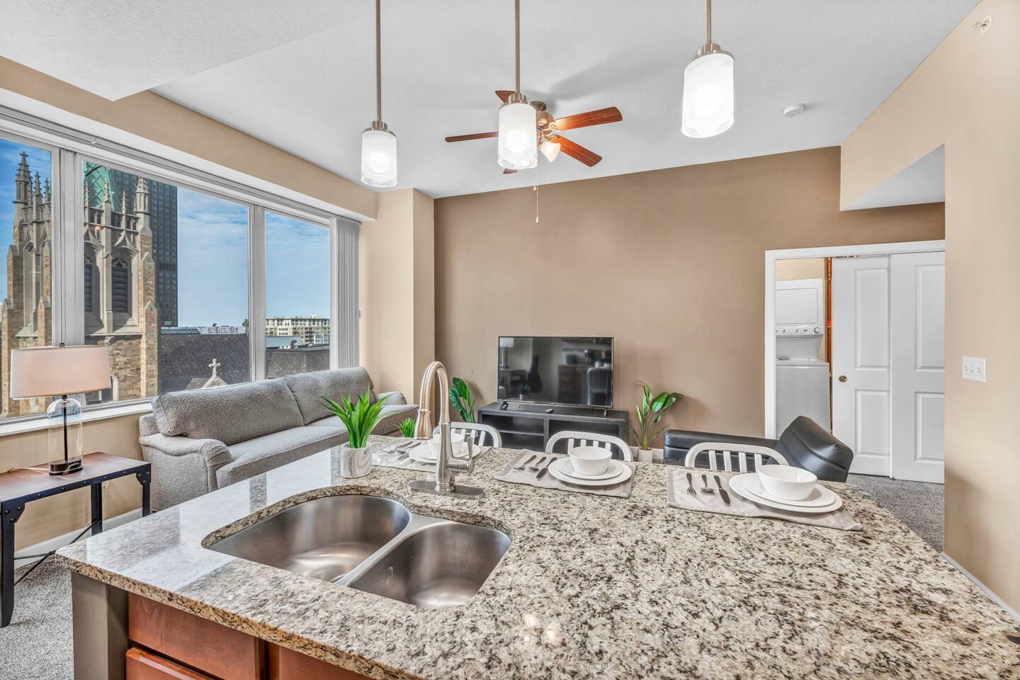 The luxurious condo is built to provide a premium getaway for visitors seeking the perfect stay. Its blend of modern elegance and upscale comfort in one of downtown Cleveland’s most desirable neighborhoods offers both relaxation and sophistication. Each room features high ceilings, stylish finishes, and carefully chosen décor that elevate the space with a contemporary yet timeless feel. Every detail is designed for comfort, from a fully equipped kitchen with modern appliances to cozy bedrooms with plush memory foam mattresses. Two highly comfortable bedrooms plus a sofa bed provide plenty of space for rest and relaxation after an exciting day exploring Cleveland. Finally, you’ll enjoy access to top-tier building amenities including a fitness center, fast elevators, 24/7 security, and nearby parking, all while being steps from restaurants, theaters, and sporting events. ★ LIVING ROOM ★ The living room is perfect for unwinding after a day in the city. Lounge on the sofa, stream your favorite shows, or enjoy the stylish setting. ✔ Queen-Size Sofa Bed ✔ Elegant Décor & Finishes ✔ 55" Smart TV with Streaming Apps ✔ Stylish Coffee Table ✔ Comfortable Seating ★ KITCHEN & DINING ★ Cook and dine in style with a chef-inspired kitchen, or take advantage of the incredible dining options just steps away. ✔ Stove & Oven ✔ Microwave ✔ Coffee Maker ✔ Toaster ✔ Blender ✔ Refrigerator/Freezer ✔ Dishwasher ✔ Sink – Hot & Cold Water ✔ Glassware, Silverware, Pots & Pans ✔ Washer/Dryer ✔ Dining Table with Seating for 4 ✔ Kitchen Island with Seating for 3 ★ SLEEPING ARRANGEMENTS – 1 BEDROOM ★ Designed for comfort and style, this spacious one-bedroom offers the perfect retreat after a day spent exploring downtown Cleveland. ♛ Master Bedroom: King-Size Memory Foam Bed ♛ Living Room: Queen-Size Sofa Bed ✔ Premium Pillows, Linens, and Sheets ✔ Spacious Closets with Hangers and Shelves ✔ Night Stands with Reading Lamps ✔ Smart TVs ★ BATHROOM ★ The condo offers a spa-like bathroom stocked with essential toiletries and fresh towels for maximum comfort. ✔ Walk-In Shower ✔ Modern Vanity with Mirror ✔ Toilet ✔ Towels ✔ Hair Dryer ✔ Essential Toiletries ★ BUILDING AMENITIES ★ ✔ Parking Available ($20/day charged after booking is approved if requested, unlimited in/out access. Most parking garages in downtown charge $10-20 per 1 entry/day) ✔ 24/7 Security ✔ Fast Elevators ✔ Fully Equipped Gym ✔ On-Site Dining: Al’s Deli (Mon–Fri, coffee, breakfast & lunch) ★ PRIME DOWNTOWN LOCATION ★ You’re within easy walking distance of Cleveland’s top attractions: ✔ Rocket Mortgage FieldHouse – 8 min walk ✔ Progressive Field – 10 min walk ✔ FirstEnergy Stadium – 12 min walk ✔ Huntington Convention Center – 10 min walk ✔ East 4th Street Dining – 6 min walk ✔ Rock & Roll Hall of Fame – 15 min walk ✔ Public Square Park – 8 min walk ✔ Lake Erie Waterfront & Pier – 15 min walk Nearby Dining: Marble Room (2 min walk), Butcher and the Brewer (6 min walk), Mabel’s BBQ (6 min walk), TownHall (7 min drive). Nearby Parks: Perk Park (3 min walk), Mall B (8 min walk), Edgewater Park & Beach (10 min drive). Medical Facilities: Cleveland Clinic (15 min drive), University Hospitals (15 min drive), MetroHealth (10 min drive). Universities: Cleveland State University (10 min walk), Case Western Reserve (15 min drive). This property combines downtown luxury with modern comfort, making it the perfect base for business, leisure, or convention travel. Whether you’re here for dining, theater, sports, or the lakefront, you’ll be right in the heart of it all.