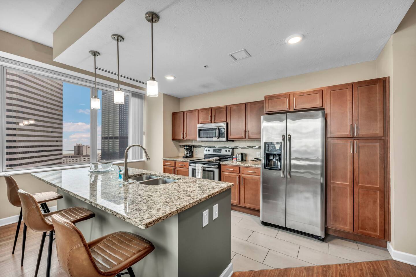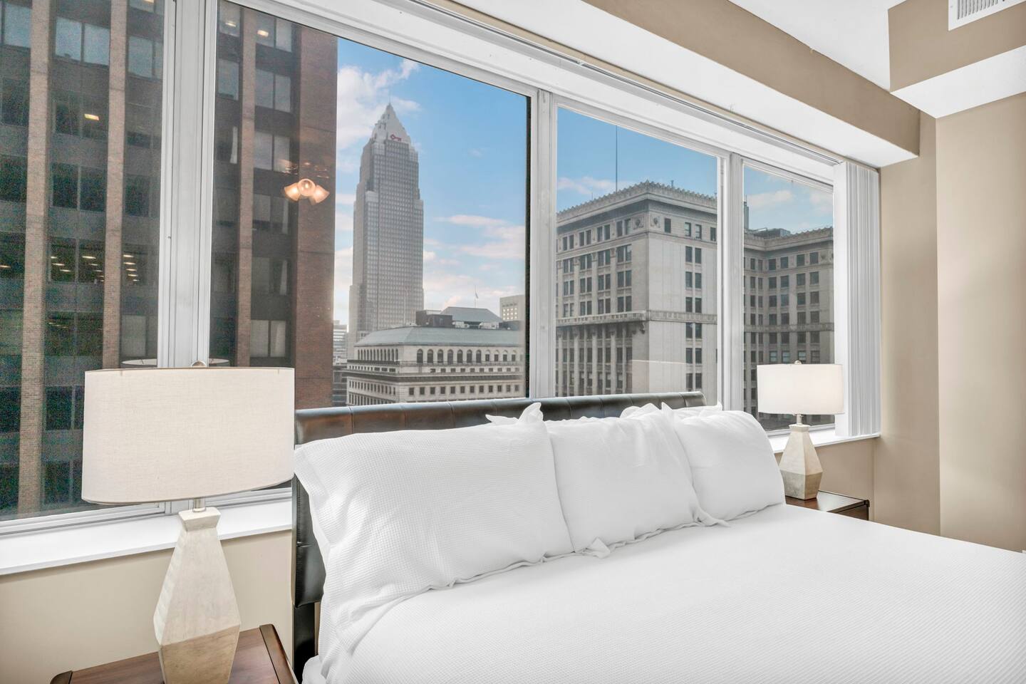 The luxurious condo is built to provide a premium getaway for visitors seeking the perfect stay. Its blend of modern elegance and upscale comfort in one of downtown Cleveland’s most desirable neighborhoods offers both relaxation and sophistication. Each room features high ceilings, stylish finishes, and carefully chosen décor that elevate the space with a contemporary yet timeless feel. Every detail is designed for comfort, from a fully equipped kitchen with modern appliances to cozy bedrooms with plush memory foam mattresses. Two highly comfortable bedrooms plus a sofa bed provide plenty of space for rest and relaxation after an exciting day exploring Cleveland. Finally, you’ll enjoy access to top-tier building amenities including a fitness center, fast elevators, 24/7 security, and nearby parking, all while being steps from restaurants, theaters, and sporting events. ★ LIVING ROOM ★ The living room is perfect for unwinding after a day in the city. Lounge on the sofa, stream your favorite shows, or enjoy the stylish setting. ✔ Queen-Size Sofa Bed ✔ Elegant Décor & Finishes ✔ 55" Smart TV with Streaming Apps ✔ Stylish Coffee Table ✔ Comfortable Seating ★ KITCHEN & DINING ★ Cook and dine in style with a chef-inspired kitchen, or take advantage of the incredible dining options just steps away. ✔ Stove & Oven ✔ Microwave ✔ Coffee Maker ✔ Toaster ✔ Blender ✔ Refrigerator/Freezer ✔ Dishwasher ✔ Sink – Hot & Cold Water ✔ Glassware, Silverware, Pots & Pans ✔ Washer/Dryer ✔ Dining Table with Seating for 4 ✔ Kitchen Island with Seating for 3 ★ SLEEPING ARRANGEMENTS – 2 BEDROOMS ★ Each bedroom is designed for comfort, relaxation, and restful sleep. ♛ Master Bedroom: King-Size Memory Foam Bed ♛ Bedroom 2: Queen-Size Memory Foam Bed ♛ Living Room: Queen-Size Sofa Bed ✔ Premium Pillows, Linens, and Sheets ✔ Spacious Closets with Hangers and Shelves ✔ Night Stands with Reading Lamps ✔ Smart TVs ★ BATHROOMS ★ Enjoy spa-like bathrooms stocked with essentials for your convenience. ✔ Walk-In Shower ✔ Modern Vanity with Mirror ✔ Toilet ✔ Towels ✔ Hair Dryer ✔ Essential Toiletries ★ BUILDING AMENITIES ★ ✔ Parking Available ($20/day charged after booking is approved if requested, unlimited in/out access. Most parking garages in downtown charge $10-20 per 1 entry/day) ✔ 24/7 Security ✔ Fast Elevators ✔ Fully Equipped Gym ✔ On-Site Dining: Al’s Deli (Mon–Fri, coffee, breakfast & lunch) ★ PRIME DOWNTOWN LOCATION ★ You’re within easy walking distance of Cleveland’s top attractions: ✔ Rocket Mortgage FieldHouse – 8 min walk ✔ Progressive Field – 10 min walk ✔ FirstEnergy Stadium – 12 min walk ✔ Huntington Convention Center – 10 min walk ✔ East 4th Street Dining – 6 min walk ✔ Rock & Roll Hall of Fame – 15 min walk ✔ Public Square Park – 8 min walk ✔ Lake Erie Waterfront & Pier – 15 min walk Nearby Dining: Marble Room (2 min walk), Butcher and the Brewer (6 min walk), Mabel’s BBQ (6 min walk), TownHall (7 min drive). Nearby Parks: Perk Park (3 min walk), Mall B (8 min walk), Edgewater Park & Beach (10 min drive). Medical Facilities: Cleveland Clinic (15 min drive), University Hospitals (15 min drive), MetroHealth (10 min drive). Universities: Cleveland State University (10 min walk), Case Western Reserve (15 min drive). This property combines downtown luxury with modern comfort, making it the perfect base for business, leisure, or convention travel. Whether you’re here for dining, theater, sports, or the lakefront, you’ll be right in the heart of it all.