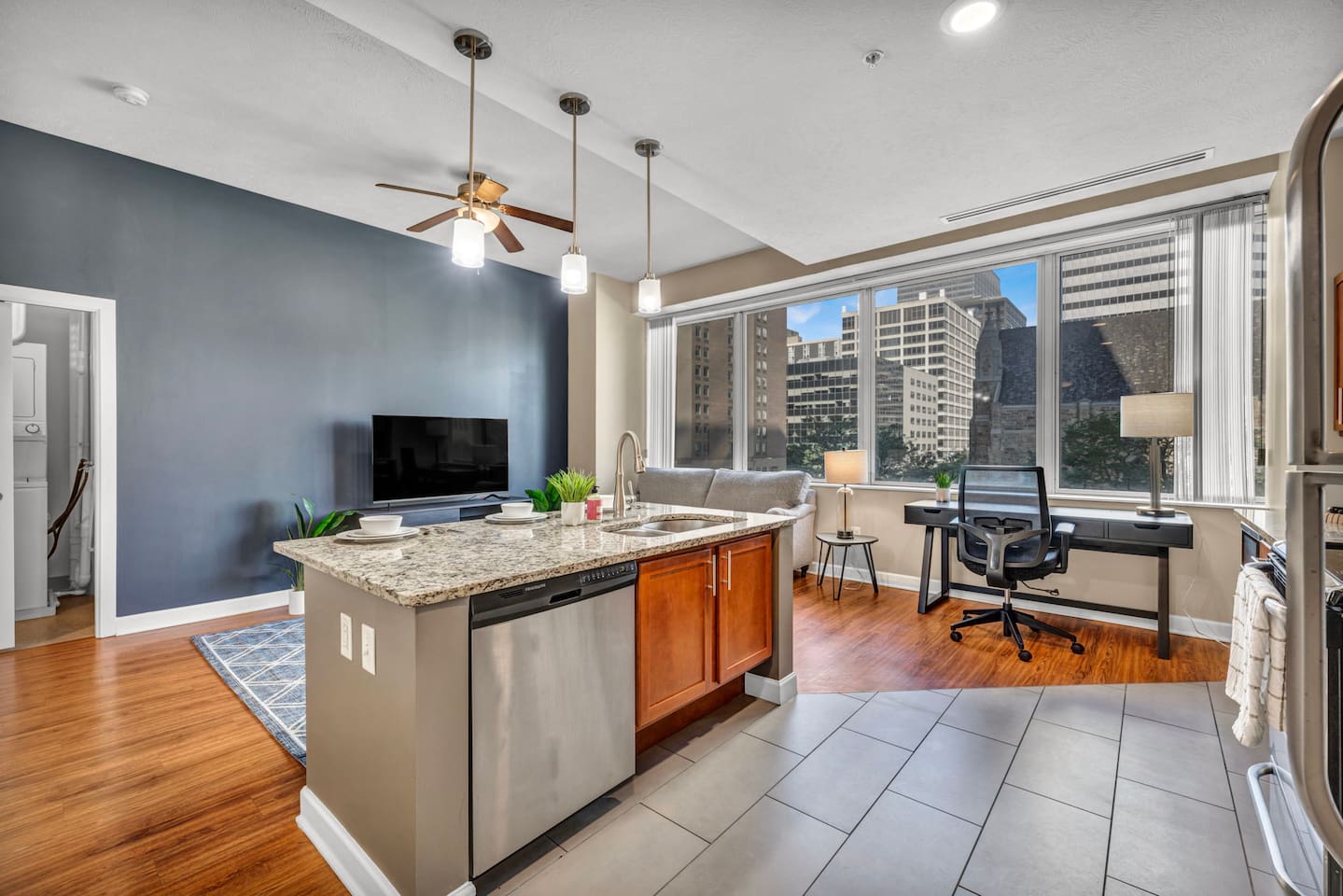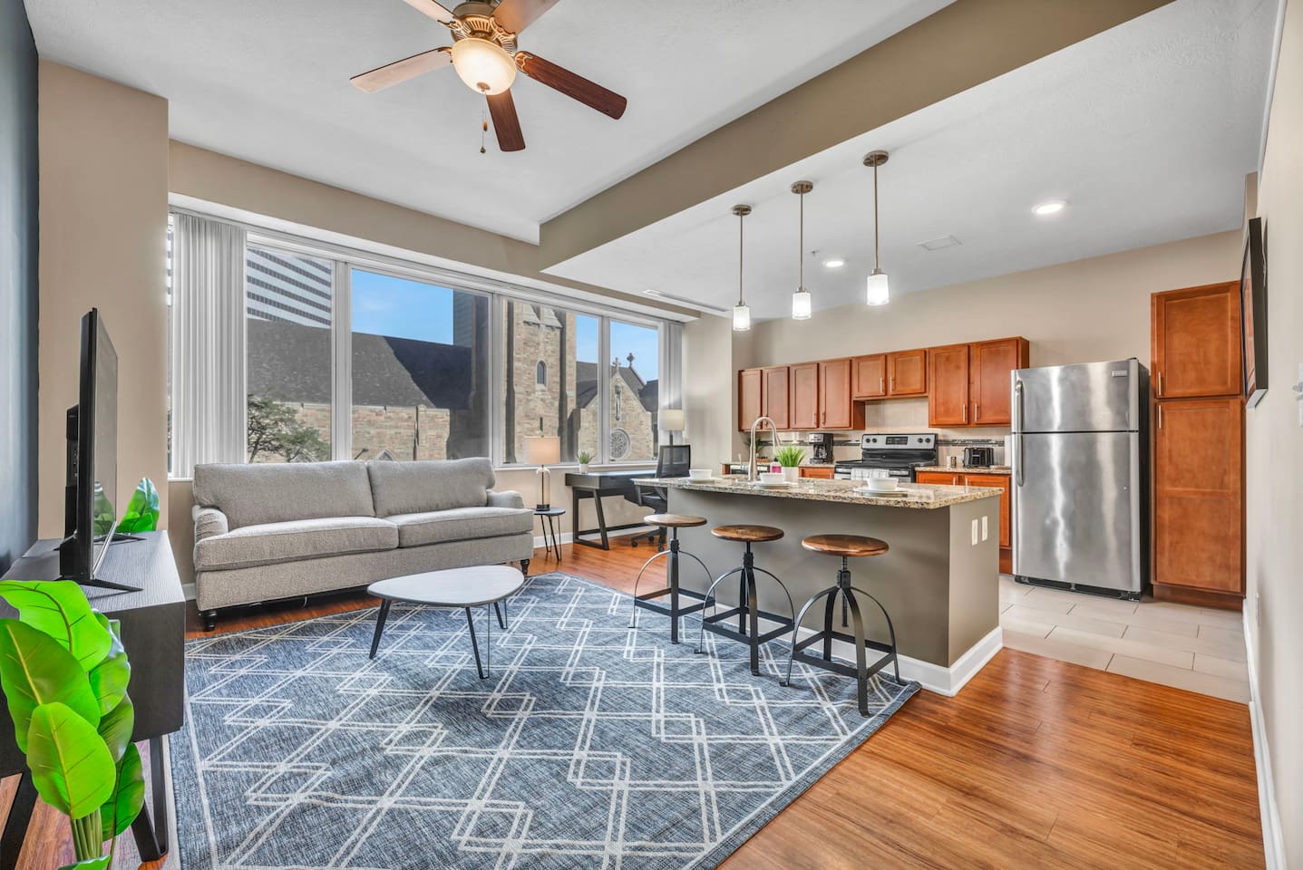 Stay at one of Cleveland’s premier luxury residences, a condo crafted for guests who value elegance, comfort, and convenience. With a Walk Score of 98/100, you’re only moments from the city’s best dining, nightlife, and attractions—then retreat to your private oasis to unwind in style. ✔️ Luxury 1BR/1Bath Condo ✔️ Open-Concept Living ✔️ Full Modern Kitchen ✔️ Smart TVs ✔️ High-Speed Wi-Fi ✔️ Workspace ✔️ Washer/Dryer ✔️ Parking available $ ✔️ 24/7 Security ✔️ Fitness Center See more below!