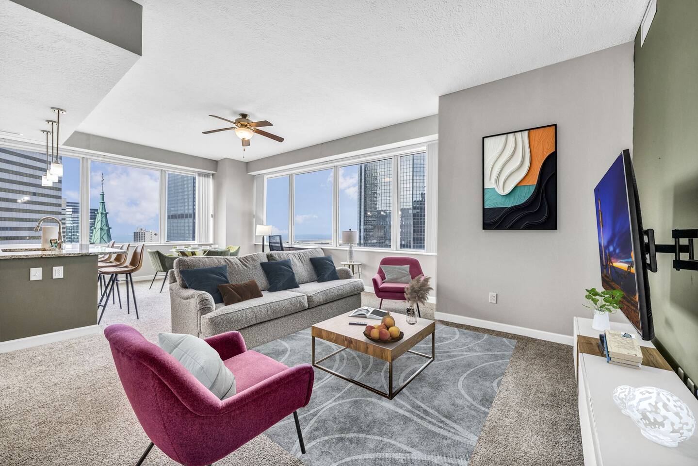 ★ ADDITIONAL ACCOMMODATION ★ Traveling in a larger group, or your preferred dates are already taken? You'll be happy to know that we offer additional units in the building with an option of renting multiple together. Please browse our host profile for the complete list of gorgeous listings. ★ CLEANING & SANITIZATION ★ Health, safety, and well-being of our guests are of utmost importance. For this reason, we use a thorough cleaning process after each check-out. ★ GUEST SCREENING & DAMAGE PROTECTION ★ The Primary Reservation holder must provide a valid Government-issued ID prior to check-in. ★ BUILDING & CONDO SECURITY MEASURES ★ • Minut noise detectors are located in the apartment and monitor noise levels. • Surveillance cameras monitor building common areas (never inside the unit). • 24/7 building security. ★ PETS ALLOWED ★ We love those little (and not so little) furry bundles of joy. We charge a $25 per night, $100 per week, or $300 per month pet cleaning fee (per pet). This fee will be charged via Airbnb Resolution Center if not collected at booking. ✔ Maximum of 2 pets, must be well trained. ✔ No aggressive breeds or pit bulls permitted. ★ NO SMOKING INSIDE ★ Please refrain from smoking inside the home. 🚭 Any evidence of smoking will result in fees for odor removal and furniture cleaning and immediate eviction without refund. ★ NO PARTIES/EVENTS ★ We kindly ask you to treat our home as your own to preserve its pristine condition for future guests and your return visits. Any unauthorized parties or events will result in immediate eviction without refund. ★ ADDITIONAL FEES ★ • Early Check-In: $25 (2 PM) or $50 (12 PM), subject to host approval and cleaner availability. • Late Check-Out: $25 (12 PM), subject to host approval and cleaner availability. • Lost Fob/Card: $150 replacement fee. Fobs/cards must be returned to the lockbox upon checkout. ★ AMENITY DISCLAIMER ★ • Amenities outside of the apartment (gym, garage, etc.) are managed by the building and subject to maintenance outside of our control. • Temporary amenity closures do not warrant a refund. Please inquire about amenity status before booking. ★ PARKING INFORMATION ★ • $20/day for unlimited in/out access for 1 car. Please message us to request a parking pass and we will send a payment request. • Parking garage is managed by an independent company across the building. • Garage clearance: 6'-3". ★ FIREPLACE NOTICE ★ The fireplace is for display only and is not functional.